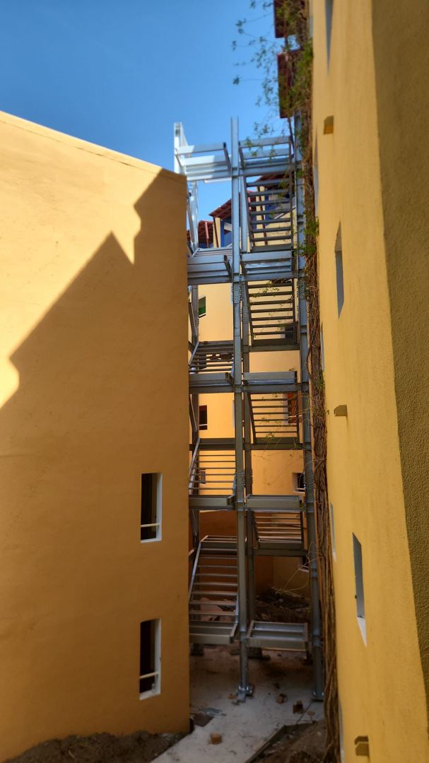 Bu projede, dar bir yapı aralığında güvenli kaçış ihtiyacını karşılamak üzere tamamen galvaniz kaplama çelik malzemeden üretilmiş bir yangın merdiveni sistemi hayata geçirilmiştir. Yapının mimari formuna uyum sağlayacak şekilde tasarlanan merdiven, yüksek dayanım gücü, uzun ömürlü kullanım ve zorlayıcı dış koşullara karşı üstün koruma sunmaktadır.